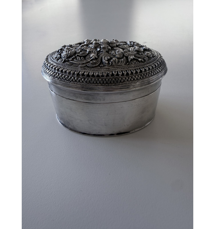 Silverbox with a flowerpattern on the lid. Plain sides. Makers mark on the bottom. In a very fine condition. Weight 89 gram.