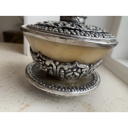 kr2,800.00Tibetan bowl in alabaster, jade and silver. Really a rare and nice piece. Weight 500 gram.