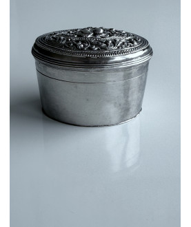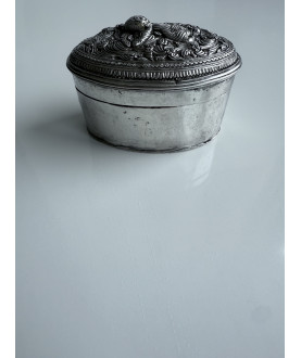 kr1,100.00Oval silver limebox with a very nice symmetrical floral pattern on top. Normally the lid is convex, but this lid is plain. Blank sides and some marks are chased into the underside of the box. In good condition. Weight 63 gram.