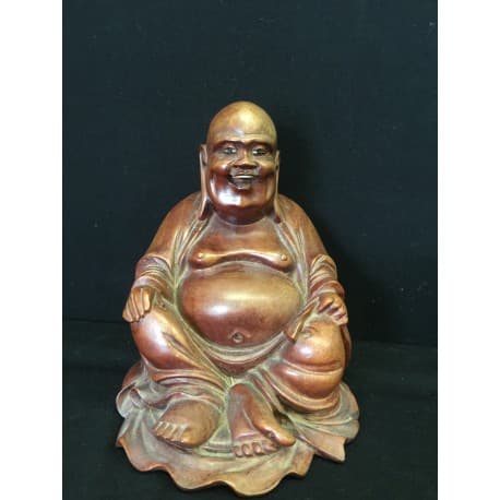 Sitting happy Buddha in hard wood. Very precise piece of work. Teeth and eyes are made of bone/mother of pearls.