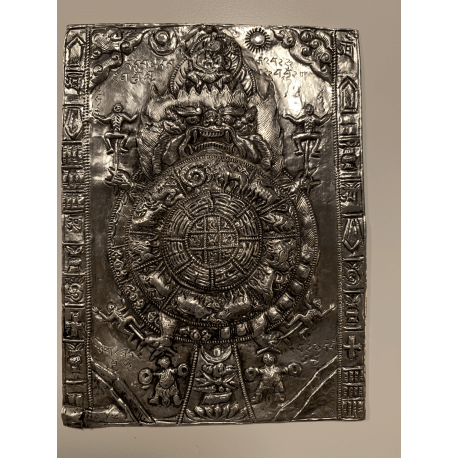 A silver plate with zodiac figures in the middle, surrounded by Maudgalyayana holding strange human alike figures in his hands. Also decorated with inscriptions. The wheel of life.