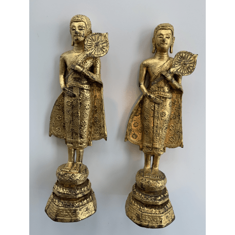A pair of gilted monks holding a fan. The latter is very rare. In a good condition. Bangkok period.