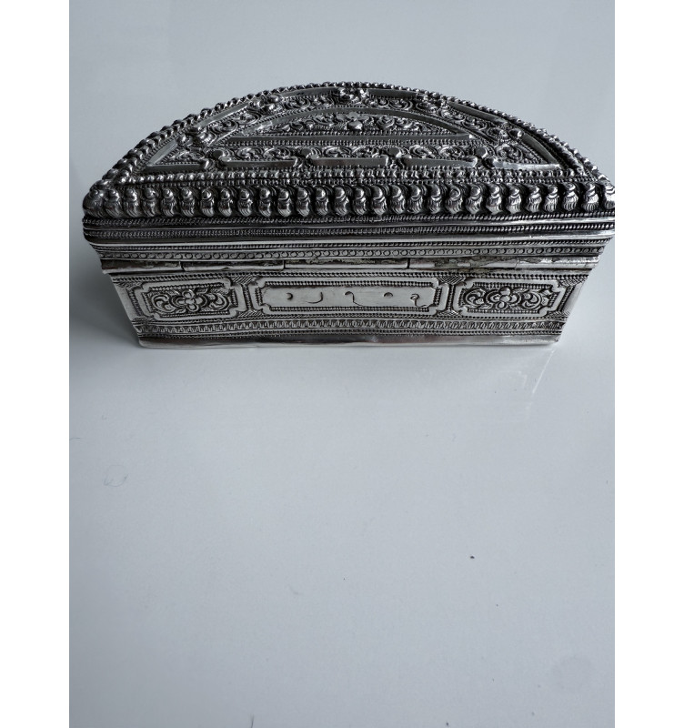 Rare quality halfmoon box covered with a detailed floral pattern on the lid and the sides. A date is on the backside. Makers mark is chased into the underside along with an unusual rare dragon. In a fine condition. Weight 112 gram.Â