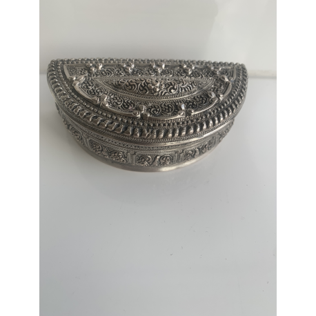 Nice half moon silver box covered with a floral pattern and with birds all around. An inscription and a dragon are chased into the underside, properly the name of the first owner and a date. In good condition. Weight 153 gram.