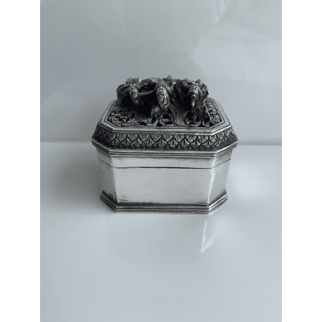 Octagonal silver box with 3 royal persons on the pierced lid in high relief. Very detailed. In a very good condition. Weight 258 gram.